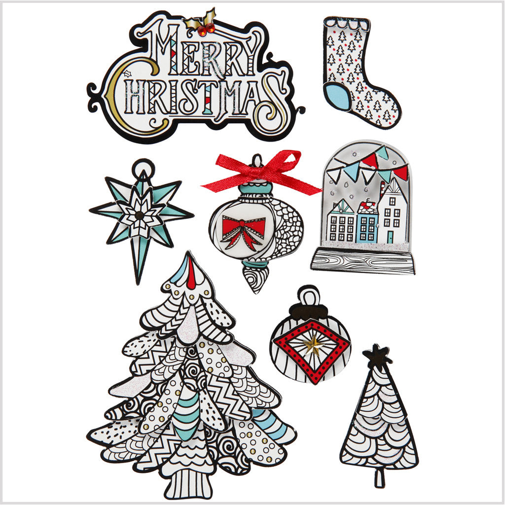 Kreieren Sie die schönsten Weihnachtsbasteleien mit diesen Weihnachtsstickern mit 3D-Effekt. Die Sticker bestehen aus mehreren Lagen, jede Lage ist aus dickem Papier gestanzt, mit klebenden Schaumstoffpads auf der Rückseite. Die Aufkleber sind einfach zu verwenden und verleihen Ihrem Kunstwerk einen festlichen Weihnachtslook. Verwenden Sie sie auf Gruß- und anderen Karten, auf Büchern, Ordnern und allem, was Sie dekorativ gestalten möchten.