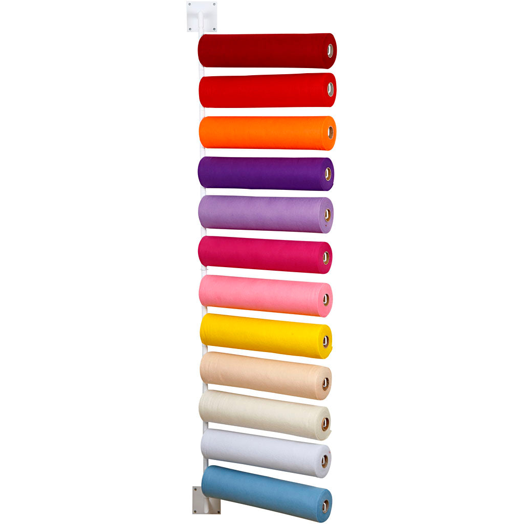 Weiß lackiertes Wandregal mit 12 Schwenkarmen, passend für Bastelfilz-Rollen - Lieferzustand unmontiert